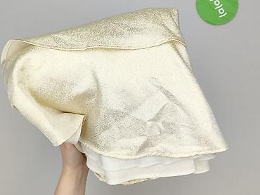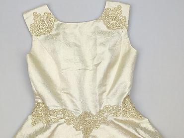 Sukienka damska bez rękawów w kolorze ecru/śmietankowym. Krój dopasowany w talii z rozkloszowanym dołem. Dół wykończony szeroką, dekoracyjną falbaną z połyskującej, złotej tkaniny o fakturze siatec...