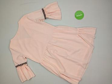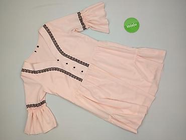 Sukienka damska, rozmiar M - Krój: prosty, długość za kolano, dekolt w serek - Rękawy: krótkie z falbanami; falbana również na dole sukienki - Wzór: złote, metaliczne kropki na pudrowo‑różowym tle...