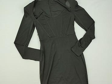 Czarna sukienka damska z długim rękawem - Krój: dopasowana góra, lekko rozkloszowany dół; długość mini z niewielkim rozporkiem z przodu. - Dekolt: prostokątny/kwadratowy, podkreślający linię ramio...