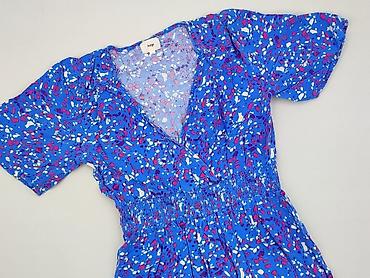 Sukienka damska w drobny kwiatowy wzór - Fason: dopasowana w talii, lekko rozkloszowany dół - Dekolt: kopertowy V-neck - Rękaw: krótki - Wzór: gęste kwiatki w odcieniach niebieskiego i bieli na cz...