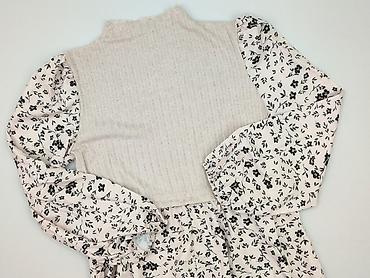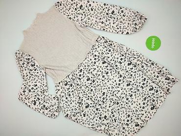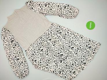 - Wzór: jasne tło w drobny, czarny, kwiatowy nadruk na rękawach i spódnicy; gładka, beżowa góra.