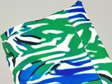 - Wzór: wyrazisty, tropikalny/roślinny w odcieniach zieleni, bieli, niebieskiego i czerni.