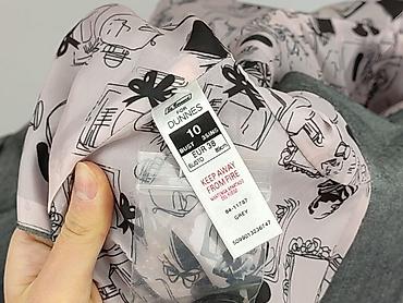 - Metki z instrukcją prania: pranie na lewej stronie w 40°C, prasowanie na lewej stronie w niskiej temp., możliwość czyszczenia chemicznego