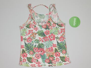 Damska koszulka na ramiączkach (tank top) z elastycznej dzianiny. - Krój: dopasowany, okrągły dekolt, średniej szerokości ramiączka. - Wzór: etniczny/ikat w wielobarwnej palecie – beż jako tło,...Stan: