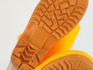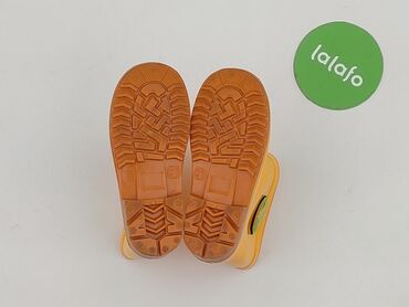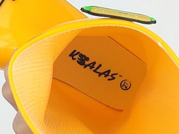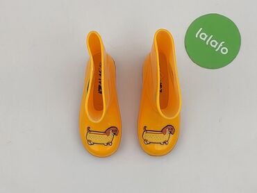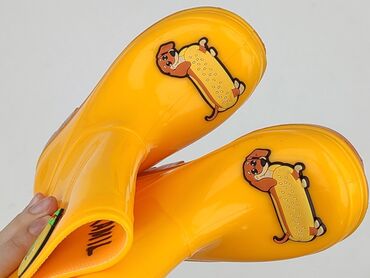 Żółte kalosze dziecięce z motywem dinozaura - Rozmiar: 25 (oznaczenie na podeszwie) - Kolor: intensywny żółty z czarną podeszwą - Zdobienia: aplikacje dinozaurów na noskach oraz po bokach cholewki...