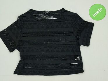 Czarny t-shirt damski, krótki (crop top) - Kolor: czarny - Krój: dopasowany, długość crop, krótkie rękawy, okrągły dekolt - Rozmiar z metki: L - Materiał: 95% poliester, 5% elastan – elastyczny, g...