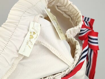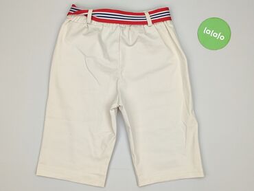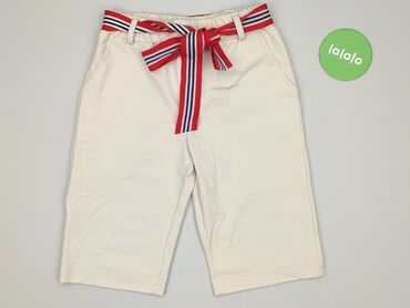 Dziewczęce bermudy w kolorze kremowym z ozdobnym paskiem w trójkolorowe pasy (czerwony/granatowy/biały) wiązanym na kokardę.