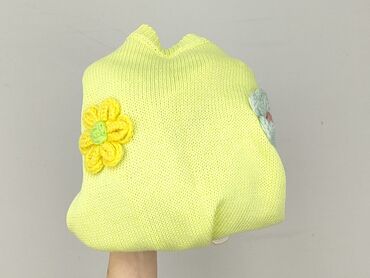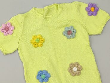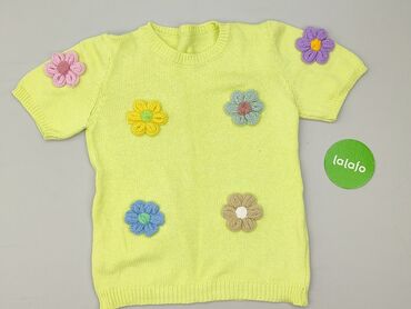 Dziewczęcy sweterek z krótkim rękawem – jasnożółty, ozdobiony naszywanymi, szydełkowymi kwiatkami w różnych kolorach (róż, fiolet, żółty, niebieski, beż, miętowy). Klasyczny, okrągły dekolt oraz ściągacze przy kołnierzu, rękawach i na dole. Gładki tył.