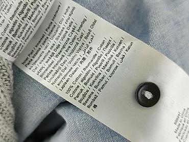 - Krój 2w1: szary, dzianinowy sweter z wszytą błękitną, koszulową wstawką (bawełniany „spód” i mankiety).