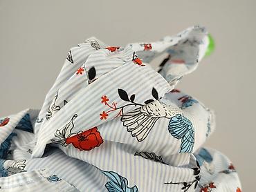 - Wzór: drobne biało‑błękitne paseczki z nadrukiem kwiatów, liści i ptaków w odcieniach niebieskiego, czerni i czerwieni