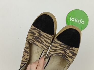 - Wierzch: materiał tekstylny z wzorem w stylu zwierzęcym (beż/brąz), czarne noski z przodu i wzmocniony czarny zapiętek
