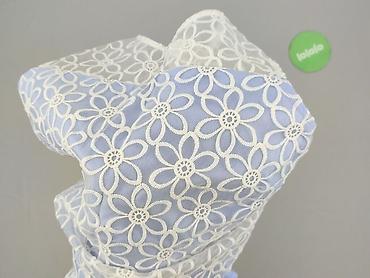 - Detale: ażurowa koronka w kwiatowy wzór na całej powierzchni; górna część (przód i tył) półprzezroczysta z koronki; dół z błękitną podszewką; zapięcie z tyłu na mały guzik