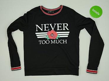 - Nadruk z przodu: napis „NEVER TOO MUCH” z motywem czerwonego kwiatu i białymi paskami