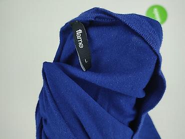 Niebieski kardigan damski marki Flame w rozmiarze L, idealny do noszenia na co dzień. Charakteryzuje się okrągłym dekoltem i zapięciem na srebrne zatrzaski. Długie rękawy zakończone są prążkowanymi mankietami, które również posiadają trzy ozdobne zatrzaski, dodające całości elegancji. Dół kardiganu również wykończony jest prążkowanym ściągaczem.