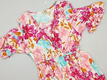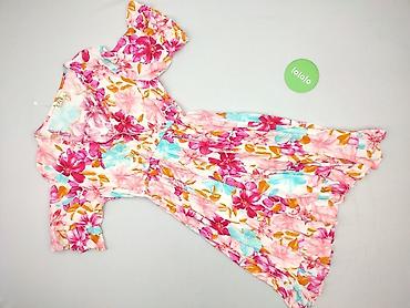 Sukienka damska F&F, rozmiar L - Krój: lekko taliowana, z gumką w pasie; krótkie rękawy, dekolt w kształcie litery V - Wzór: intensywny, wielobarwny print w kwiaty na jasnym tle (odcienie niebiesk...
