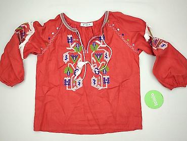 Bluzka damska w etniczno-kwiatowy wzór - Kolor: intensywna czerwień z drobnymi kwiatkami w odcieniach niebieskiego i beżu; na rękawach szersze, dekoracyjne pasy z dużymi kwiatami i bordiurą. - Kró...Rozmiar: