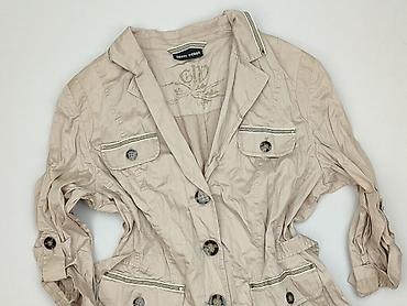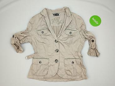 Damska marynarka F by C&A - Krój: krótka, taliowana, jednorzędowa - Kolor: jasny beż - Zapięcie: 4 guziki z przodu; na mankietach po 3 guziki - Kołnierz: z klapami - Kieszenie: 2 naszywane kieszen...Stan: