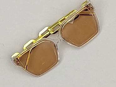 Stylowy dodatek dla kobiet szukających oryginalnych, geometrycznych okularów w złoto–transparentnej oprawie z brązowymi szkłami.