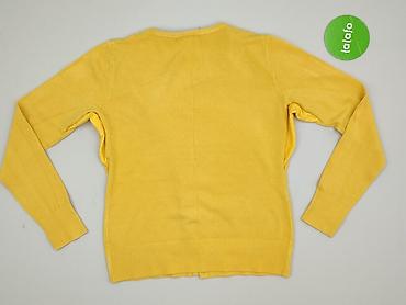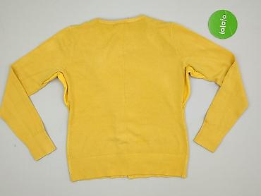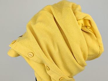 Żółty kardigan damski na guziki - Krój: klasyczny, zapinany na 7 guzików z przodu - Dekolt: okrągły - Rękawy: długie, lekko rozszerzane przy mankietach - Długość: do bioder - Dzianina: drobny splo...