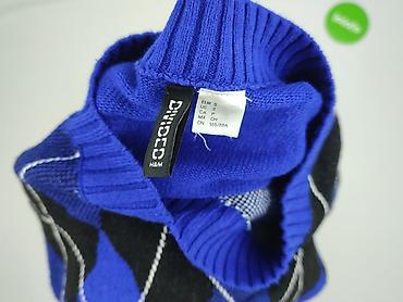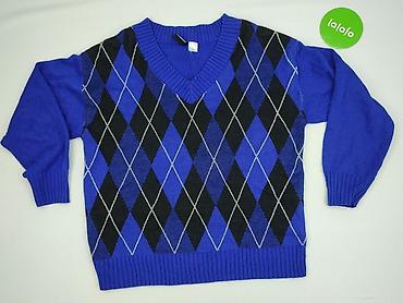 - Wzór argyle na przodzie: romby w odcieniach kobaltu i czerni z białymi liniami