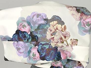 - Wzór: duże, malarskie kwiaty w odcieniach fioletu, różu, granatu i beżu na jasnym tle