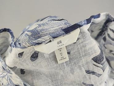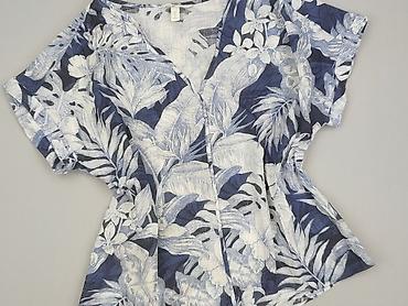Dla kobiety; kategoria: odzież damska, bluzka. Marka widoczna na metce: H&M L.O.G.G. Rozmiar z metki: M (EUR/UK). Kolorystyka: granat/biel, motyw liści monstery i kwiatów.