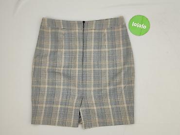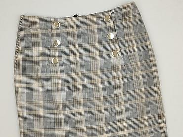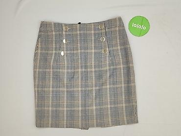 Spódnica damska H&M, ołówkowa, w kratę księcia Walii (szaro‑kremowa z czarnym przeplotem). Elegancki, dwurzędowy front z sześcioma złotymi guzikami dekoracyjnymi. Z tyłu kryty zamek oraz rozporek dla wygody chodzenia.