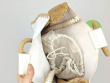 - Materiał: zewnętrzna powłoka z gładkiej skóry/eko‑skóry; dekoracyjne obszycie i uchwyty z plecionego sznurka/juty