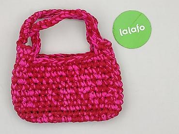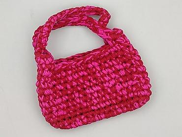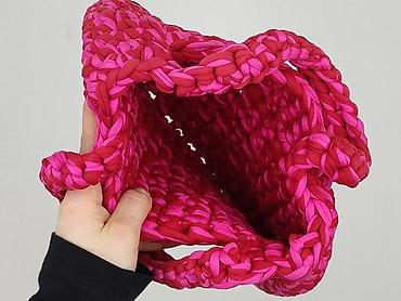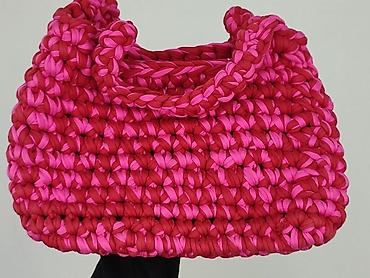 Ręcznie robiona torebka damska z przędzy bawełnianej (t-shirt yarn), pleciona grubym splotem. Dwukolorowa: intensywny róż i malinowa czerwień, tworzące efektowny, teksturowany wzór. Model typu mini/baguette z krótkimi, podwójnymi uchwytami do noszenia w dłoni lub na przedramieniu.