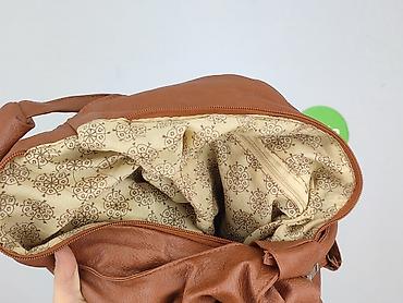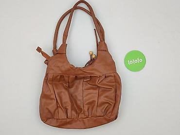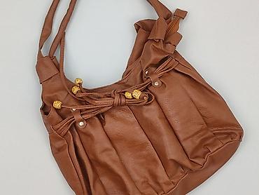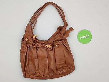 Torebka damska, kolor karmelowy/brązowy, miękka ekoskóra. Model na ramię z dwiema wygodnymi rączkami. Przód zdobiony marszczeniami, skórzanym wiązaniem i dekoracyjnymi, żółtymi koralikami; metalowe nity w kolorze złotym. Tył gładki z delikatnymi przeszyciami.