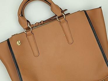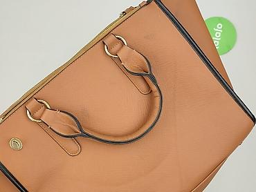 Torebka damska shopper, kolor karmelowy (camel) z czarnymi lamówkami i złotymi okuciami.