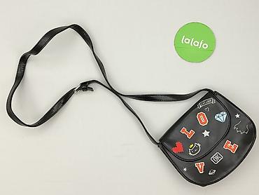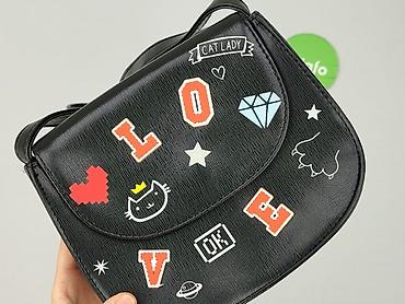 Mała czarna torebka na ramię z długim, regulowanym paskiem. Model wykonany z imitacji skóry, na klapce kolorowe nadruki i naszywki w stylu pop (napis LOVE, serce, diament, kotek, gwiazdki).