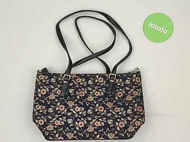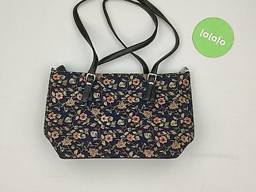 - Materiał: tkanina żakardowa z kwiatowym wzorem w odcieniach różu i zieleni na granatowym tle; wykończenia i paski z czarnej skóry/ekoskóry z fakturą