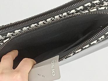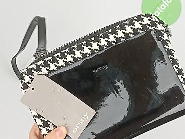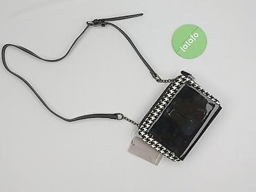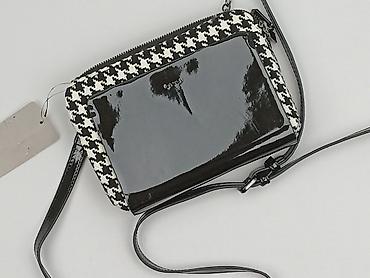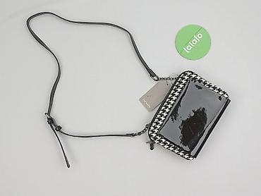 - Materiał: front z lakierowanej ekoskóry o wysokim połysku; boki i obwód z tkaniny w pepitkę; pasek z ekoskóry; elementy metalowe w ciemnym odcieniu