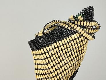- Wykonanie: ręcznie pleciona z dużych kremowych koralików i czarnych fasetowanych paciorków; pasek również z paciorków