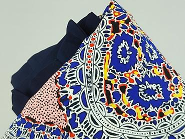 - Wzór: wyrazisty paisley na jasnoróżowym tle, kontrastowe granatowe boczne panele i lamówki