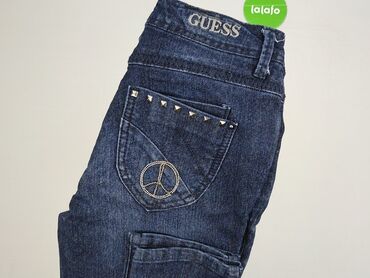 Damskie jeansy marki Guess w kolorze ciemnoniebieskim. Spodnie posiadają przetarcia na udach, które są wzmocnione pod spodem, oraz ozdobne ćwieki wokół kieszeni z przodu i z tyłu. Na prawej tylnej kieszeni znajduje się haftowany symbol pokoju. Jeansy mają zapięcie na zamek błyskawiczny i guzik, oraz klasyczny krój z pięcioma kieszeniami.