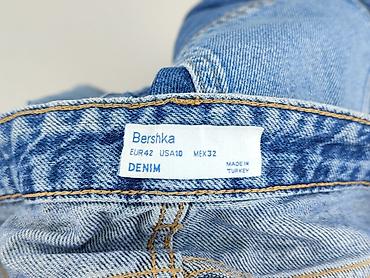 - Krój: prosta nogawka z wyraźnym, panelowym patchworkiem w trzech odcieniach niebieskiego
