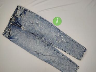 Jeansy damskie Sinsay – Mom Fit, rozmiar 38 - Fason: Mom Fit, średni stan, proste nogawki - Kolor: klasyczny niebieski denim z przetarciami i dużymi dziurami na kolanach (efekt distressed) - Mater...