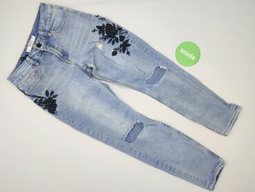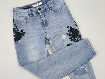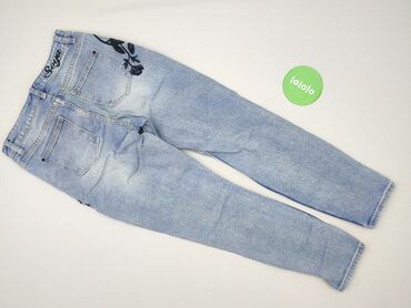 Dziewczęce jeansy z naszywkami i nadrukiem kwiatowym - Kolor: klasyczny denim/niebieski - Krój: zwężane nogawki, średni stan, szlufki na pasek - Zapięcie: guzik i zamek - Kieszenie: 2 z przodu (w ...Stan: