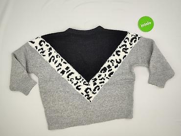 Damski sweter/bluza z dekoltem V w panterkę - Rozmiar z metki: L - Skład: 95% poliester, 5% elastan – miękki, elastyczny i wygodny materiał - Kolorystyka: szaro‑czarny nadruk w panterę z delikatny...Rozmiar: