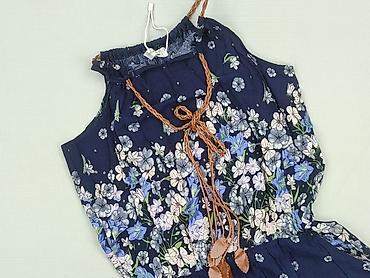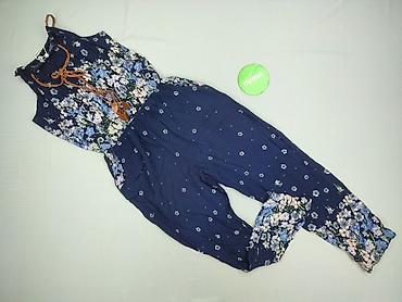 - Kolor i wzór: granatowa baza, drobne kropki i motyw kwiatów (odcienie bieli, błękitu, zieleni); kwiatowe wstawki na górze i przy dołach nogawek