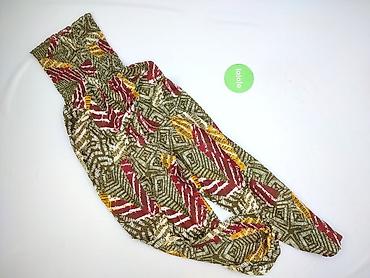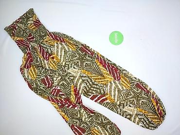 Szerokie spodnie damskie typu alladynki/haremki z wysokim, elastycznym pasem. Zwiewna tkanina z orientalnym, etnicznym wzorem w odcieniach oliwkowej zieleni, musztardowego żółtego, bordo i bieli.