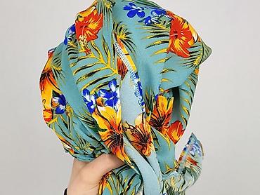 - Wzór i kolor: turkusowe tło z tropikalnym printem – liście palm i kwiaty w odcieniach żółci, pomarańczu, zieleni i kobaltu.