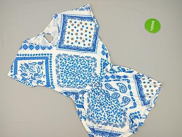 Kombinezon damski bez ramiączek (hiszpanka) – letni, wzorzysty - Fason: krótki kombinezon z elastyczną, marszczoną górą (smocking) i krótkimi nogawkami - Kolor/wzór: kremowa baza z niebieskimi i g...Rozmiar:
