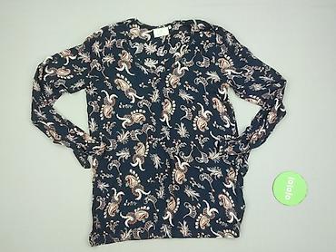 Bluzka damska KappAhl, rozmiar S. - Fason: luźny, z zakładanym/dekoltem kopertowym z przodu, falbanki przy stójce. - Rękawy: długie z elastycznymi mankietami. - Wzór: botaniczny/kwiatowy na granato...