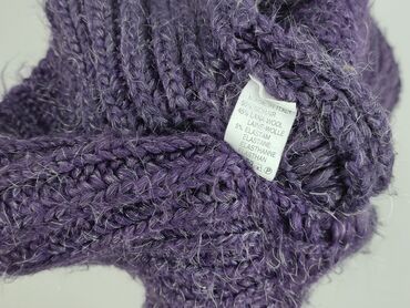 W serekFioletowy bezrękawnik/sweterko-kamizelka z miękkiej przędzy z domieszką moheru. Szeroki, otulający kołnierz szalowy, z przodu układający się w kształt litery V. Wyraźny, gruby splot łączący różne faktury: prążkowane wykończenia dołu i kołnierza, a na korpusie dekoracyjny, ażurowy wzór. Brak zapięcia – model noszony otwarty.