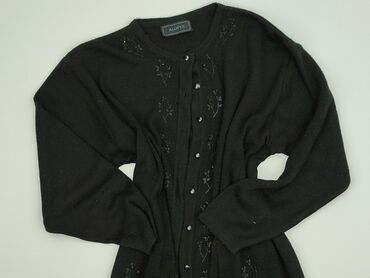Czarny kardigan damski bez zapięcia, rozm. L/XL. - Fason: lekko wydłużony, z długim rękawem, otwarty przód. - Dekolt: okrągły, ozdobny pasek z drobną lamówką i trzema dekoracyjnymi elementami przy...