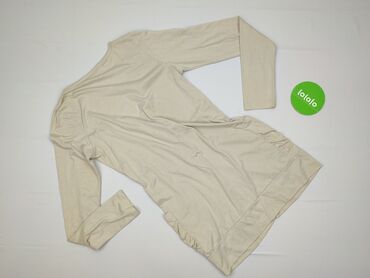 Kardigan damski beżowy - Fason: cienki, zapinany na guziki z przodu - Dekolt: szeroki, zaokrąglony; delikatne marszczenie pod dekoltem - Rękawy: długie - Dół i mankiety: ściągacze prążkowane - Mat...