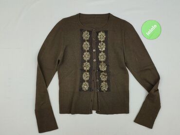 Brązowy damski kardigan na guziki - Klasyczny, prosty fason z okrągłym dekoltem - Zapięcie na rząd małych, dopasowanych kolorystycznie guzików - Długie rękawy - Szerokie, prążkowane ściągacze przy...